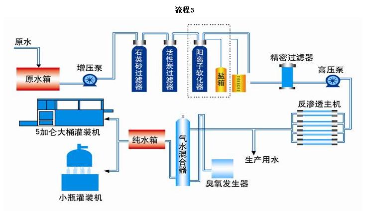 原水→原水箱→原水泵→多介質(zhì)過濾器(石英砂過濾器)→活性炭過濾器→軟水處理器→精密過濾器→高壓泵→一級反滲透(RO)裝置→純凈水箱→高壓泵→二級反滲透→紫外線裝置→用水點(diǎn)