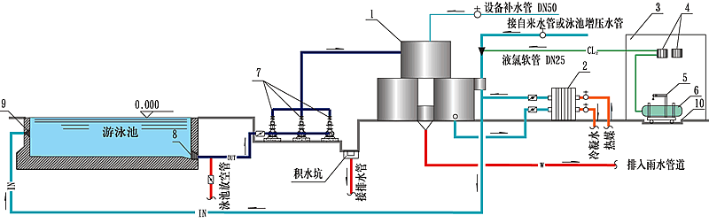 (1)整個泳池恒溫加熱系統(tǒng)需要與泳池整套水處理系統(tǒng)連接使用;(2)以上冷水、熱水、回水、380V電源均在1米接口范圍內(nèi) |